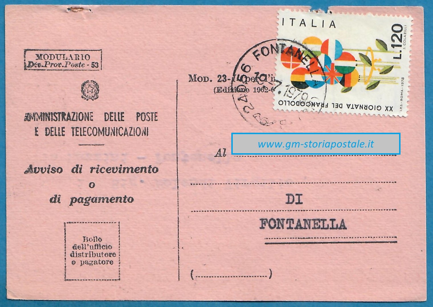 Viaggiato tra 1.11.1976 e 31.12.1980, affrancato con 120 lire Giornata del Francobollo 1978 (Colazilli) isolato