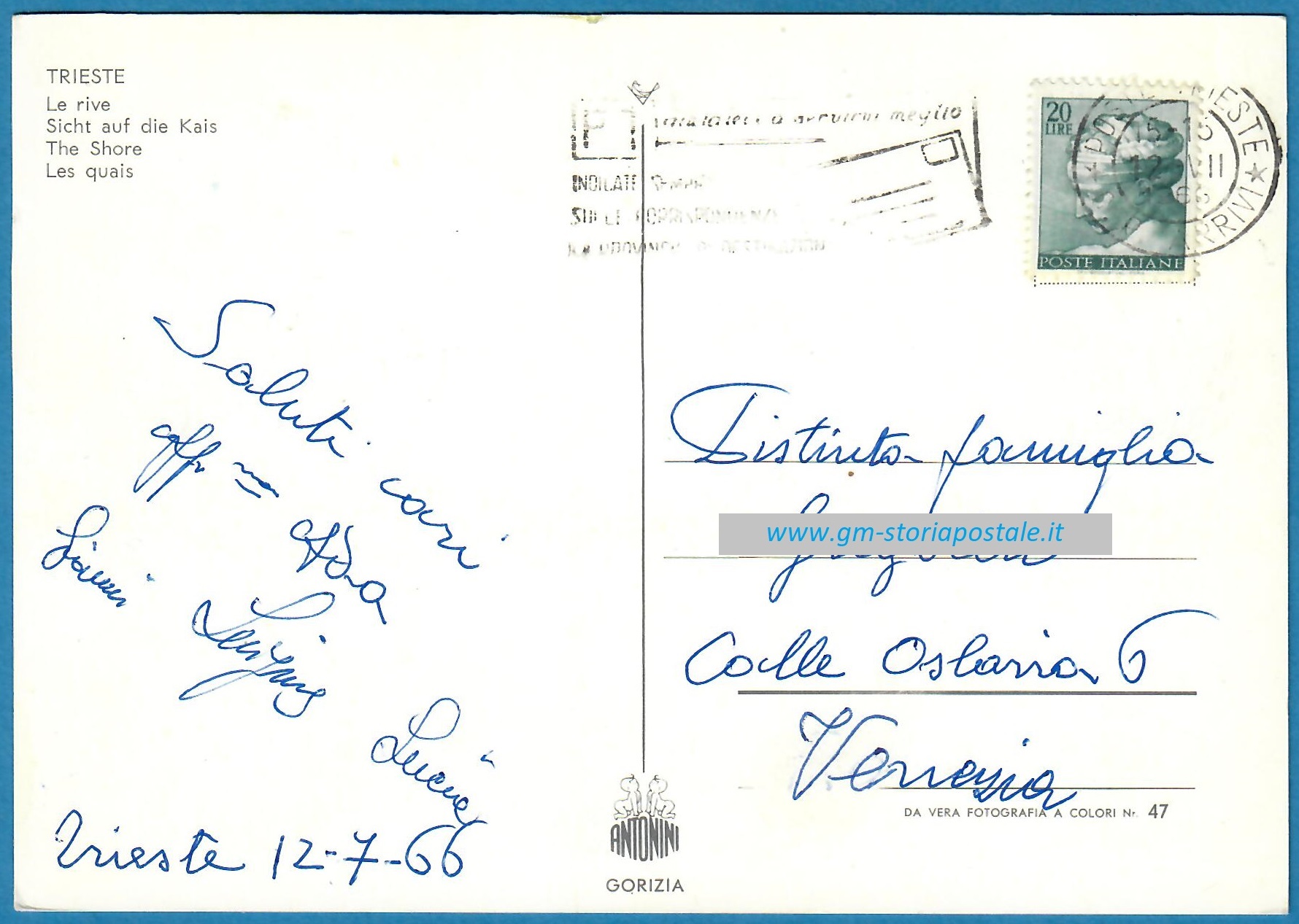 20 lire Michelangiolesca isolato – annullo con targhetta di Trieste, 12 luglio 1966: