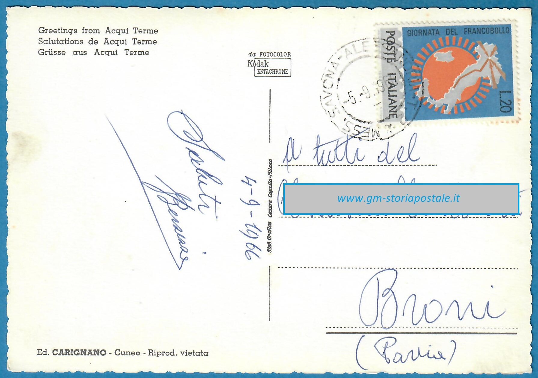 20 lire Giornata del Francobollo 1965 isolato – Messaggere Savona Alessandria, 5 settembre 1966: