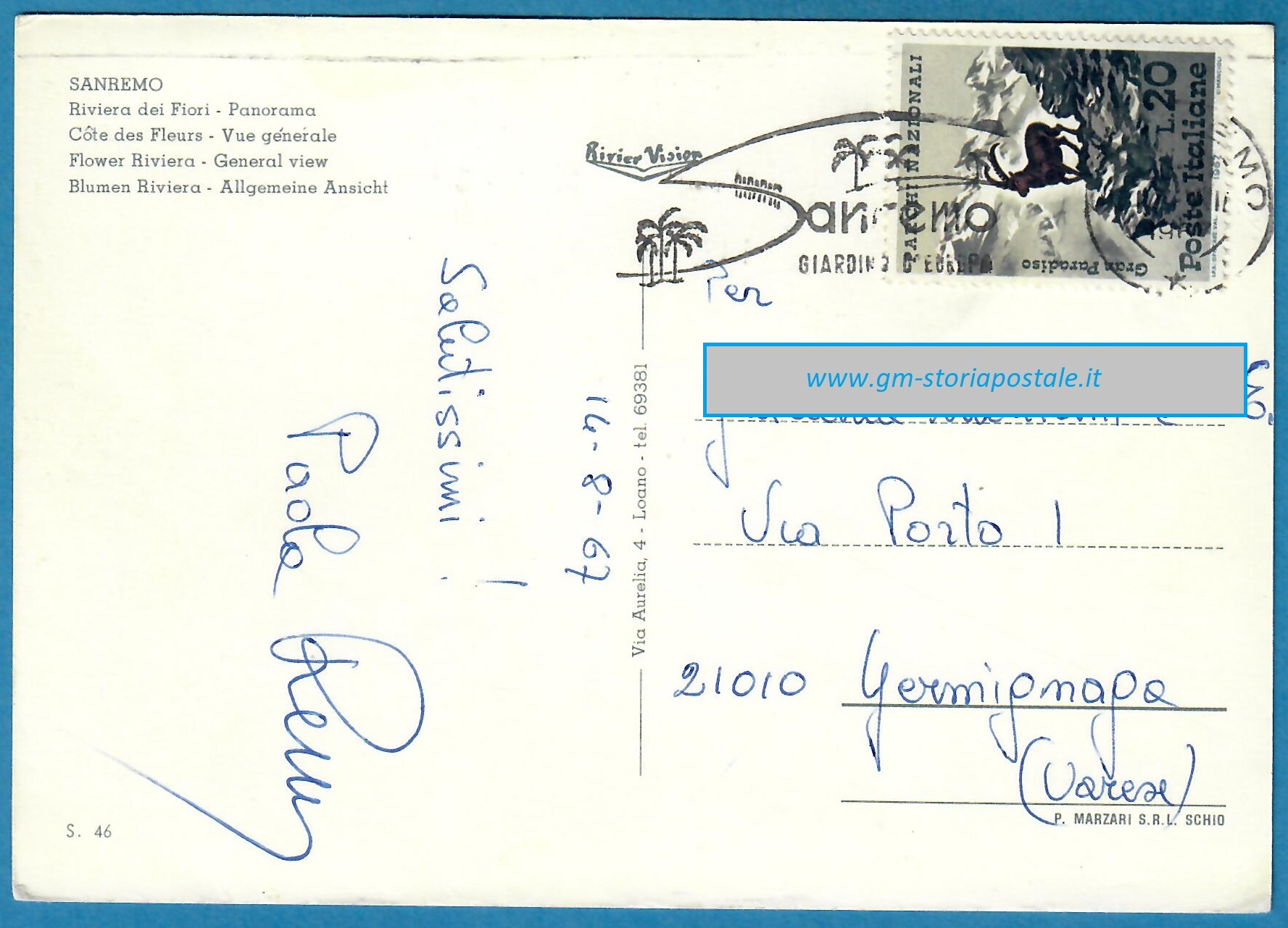 20 lire Parco Nazionale del Gran Paradiso isolato – annullo con targhetta di Sanremo, 14 agosto 1967:
