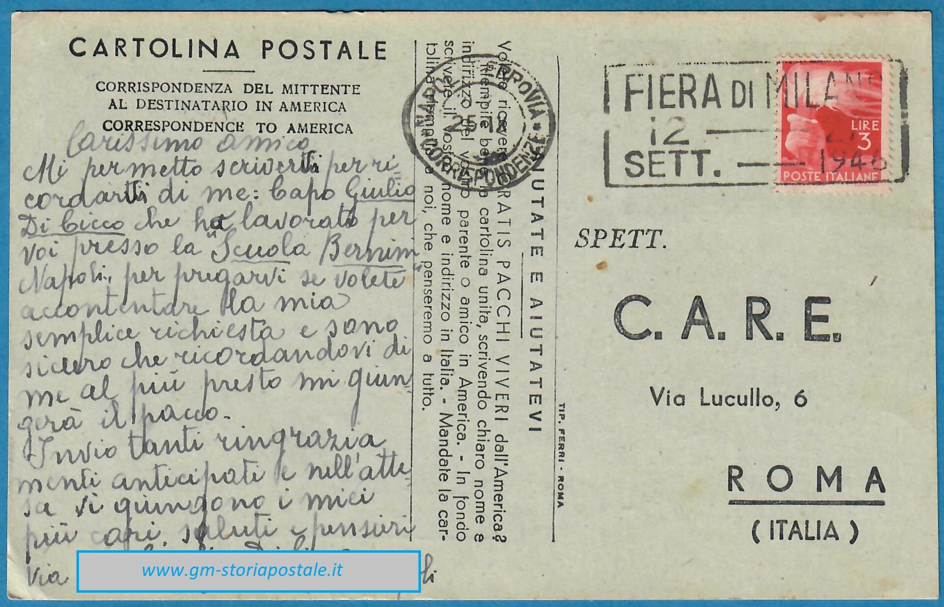 3 lire Democratica isolato su cartolina dei pacchi C.A.R.E. – Napoli (annullo con targhetta), 25 settembre 1946: