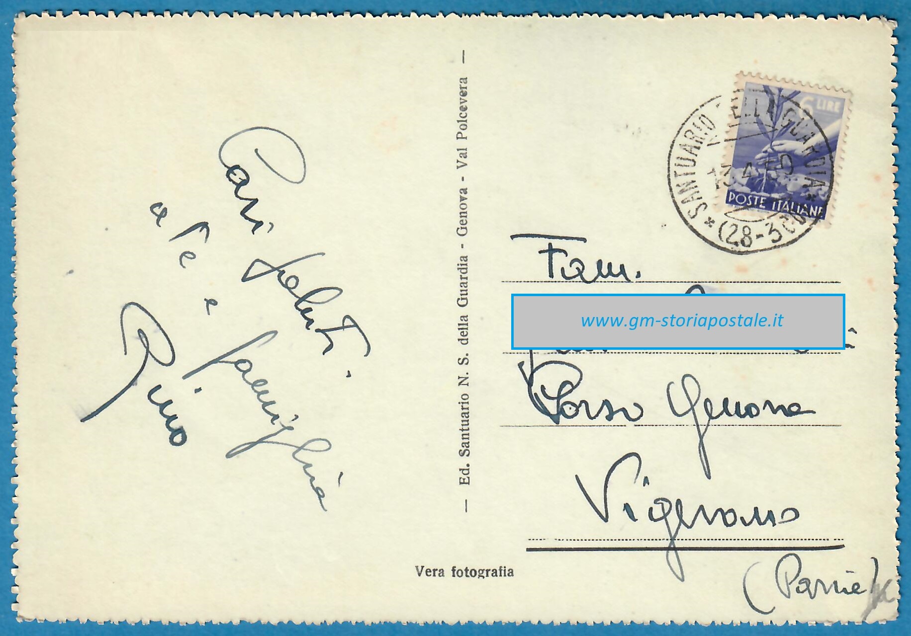 6 lire Democratica isolato – annullo frazionario del Santuario della Guardia, 13 aprile 1950:
