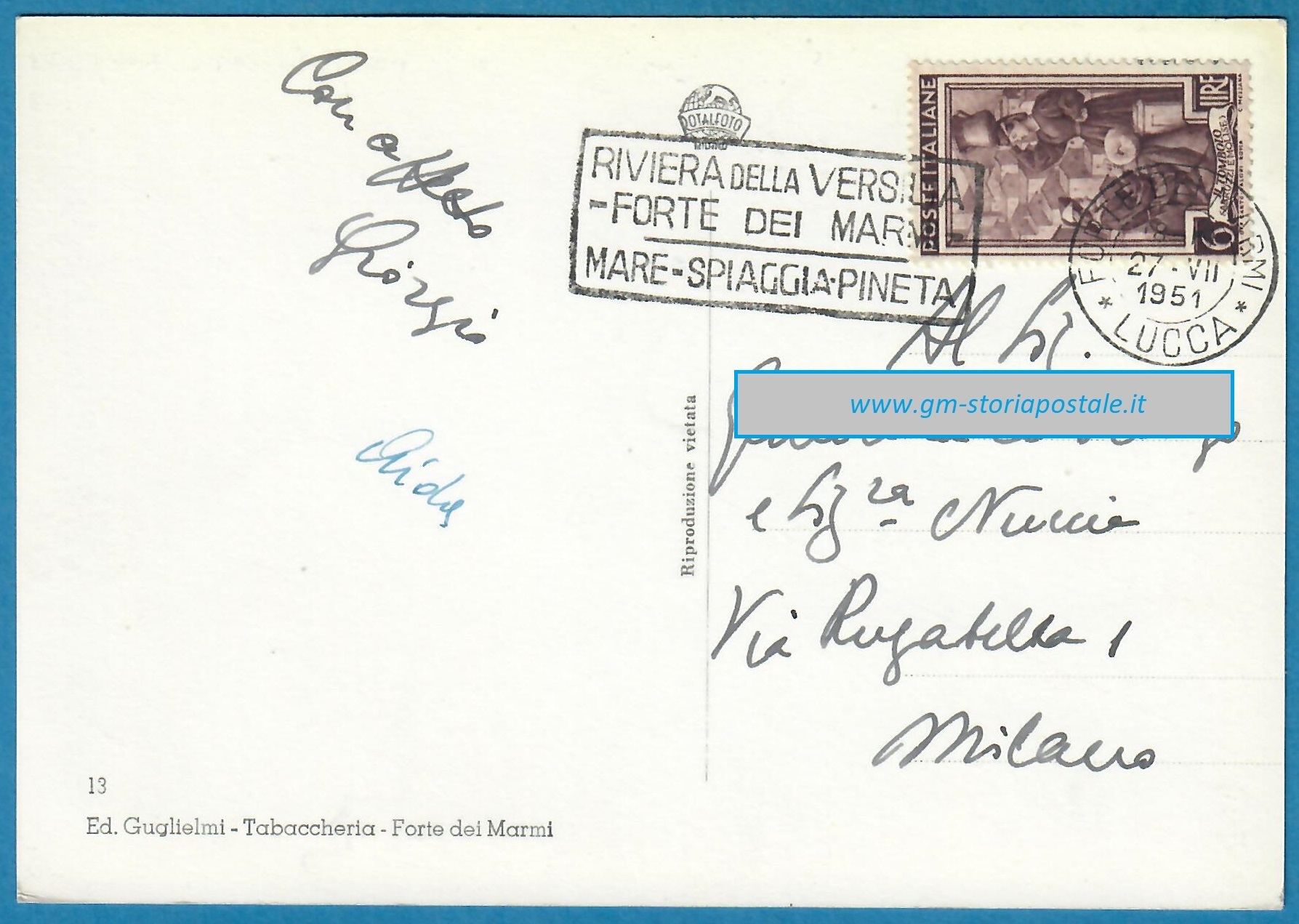 6 lire Italia al Lavoro isolato – annullo con targhetta di Forte dei Marmi, 27 luglio 1951: