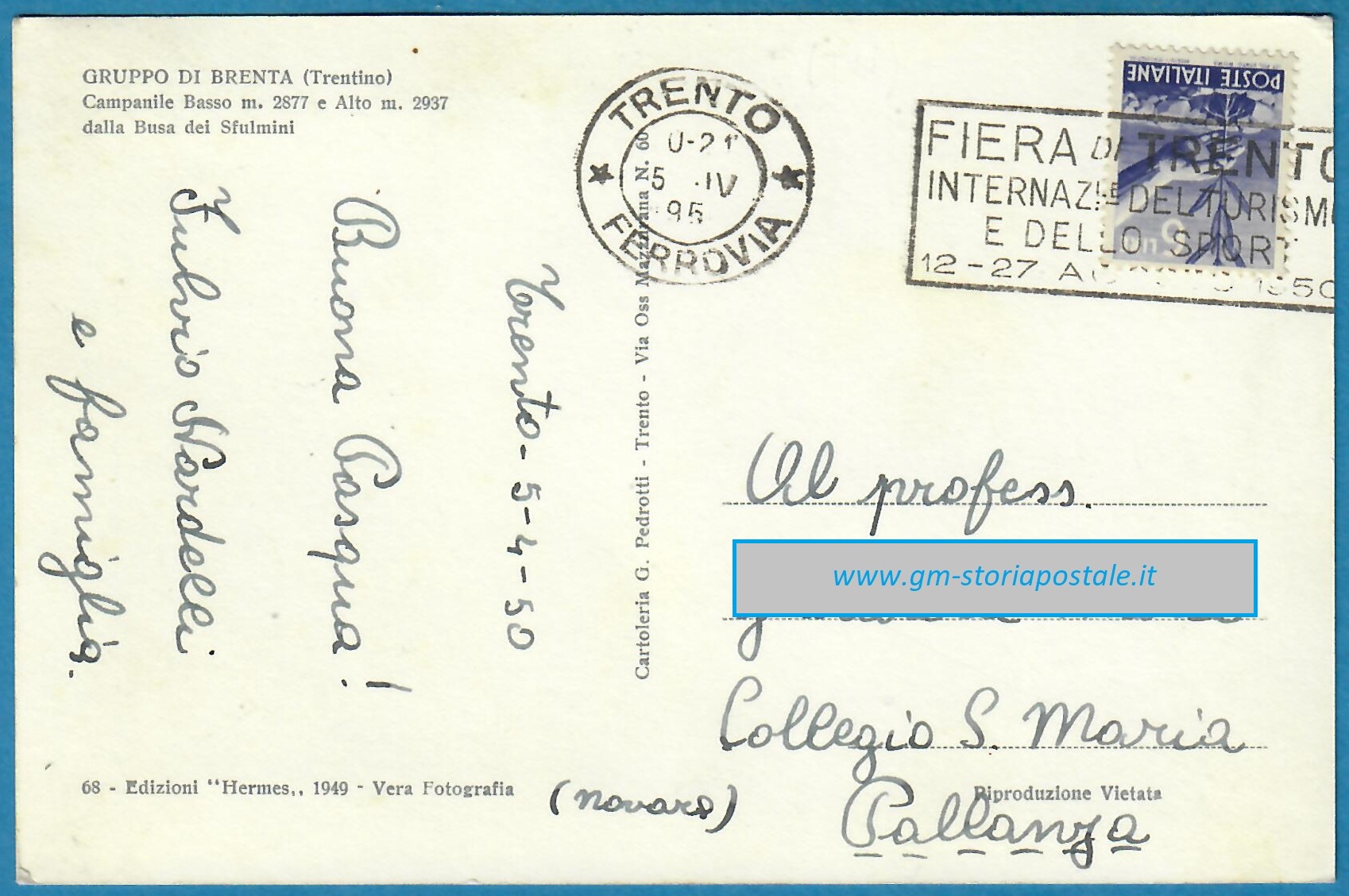 6 lire Democratica isolato – annullo con targhetta di Trento, 5 aprile 1950: