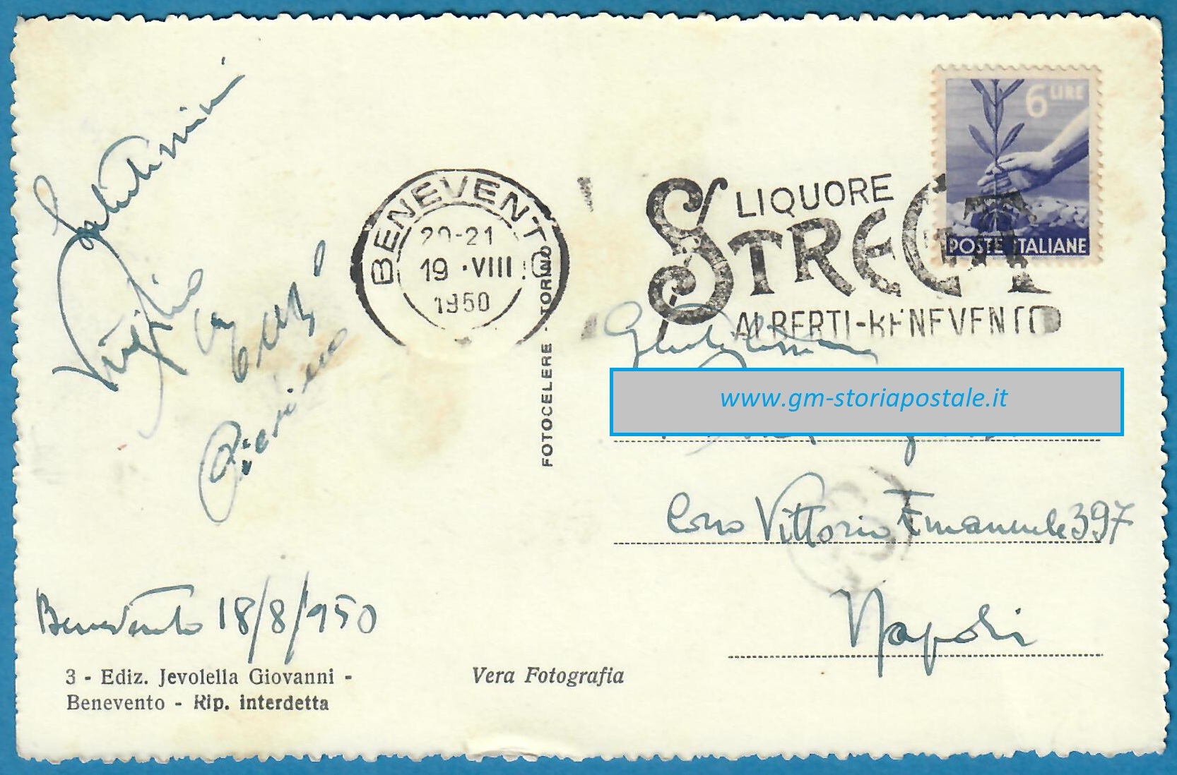 6 lire Democratica isolato – annullo con targhetta di Benevento, 19 agosto 1950: