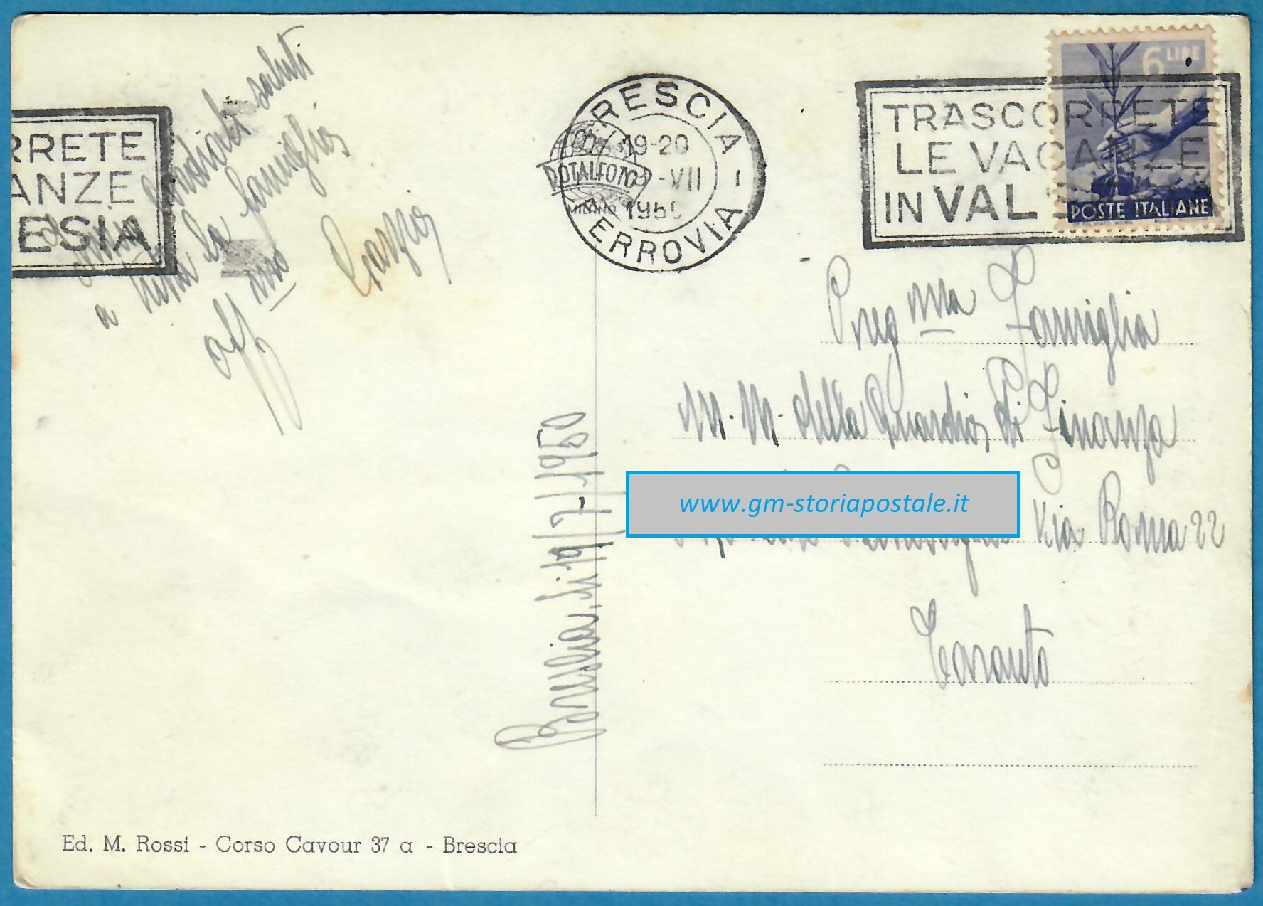 6 lire Democratica isolato – annullo con targhetta di Brescia, 19 luglio 1950: