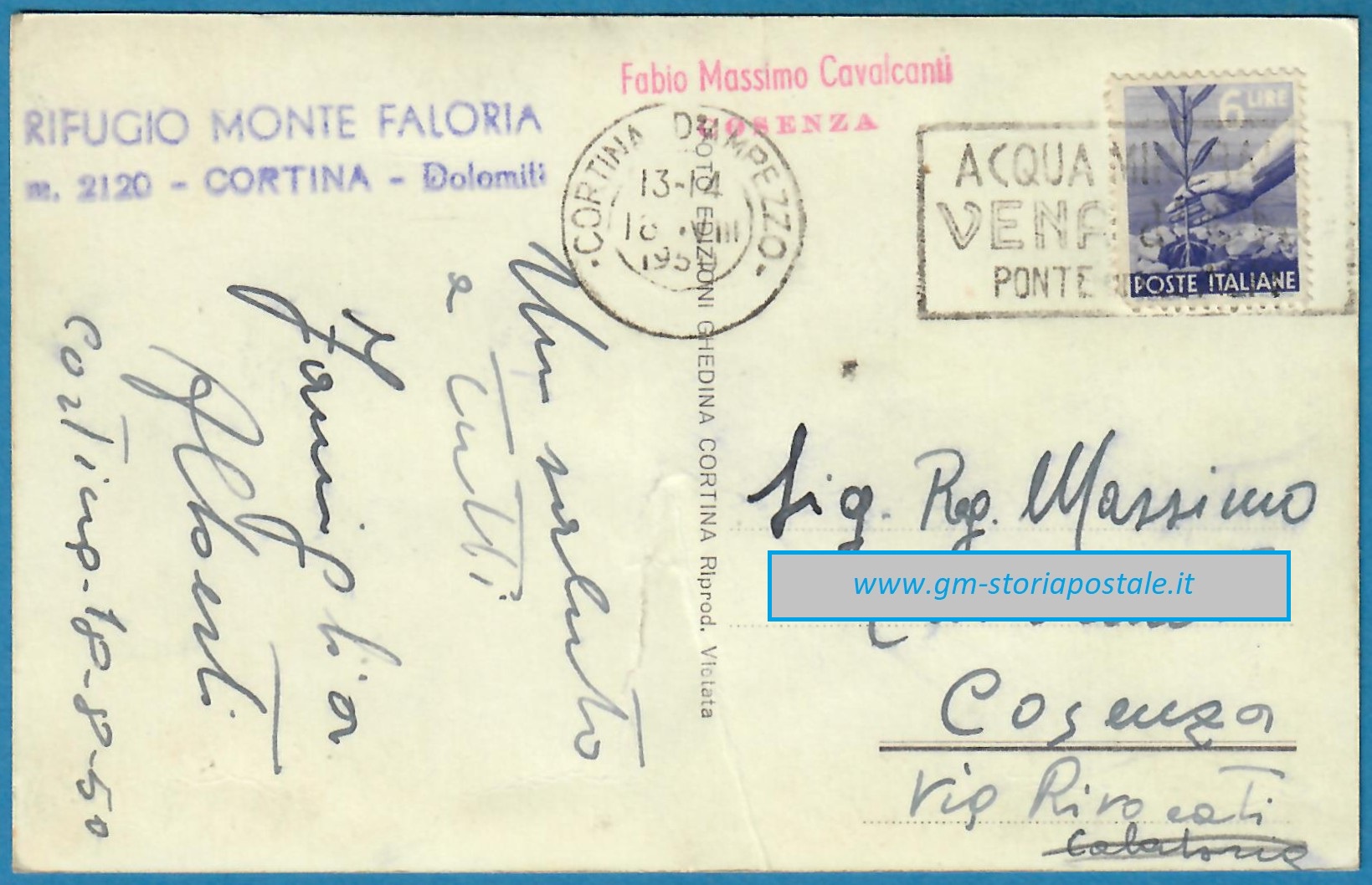 6 lire Democratica isolato – annullo con targhetta di Cortina d’Ampezzo, 18 agosto 1950: