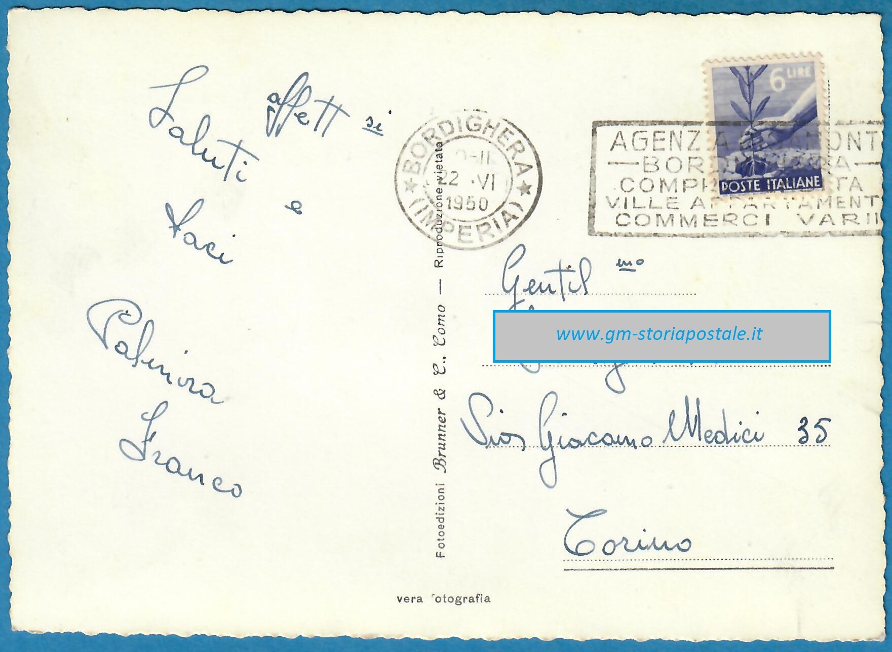 Anche prima del 1° gennaio 1950 la cartolina per l’interno illustrata e con testo inferiore a cinque parole di convenevoli si affrancava con una tariffa ridotta di 6 lire.