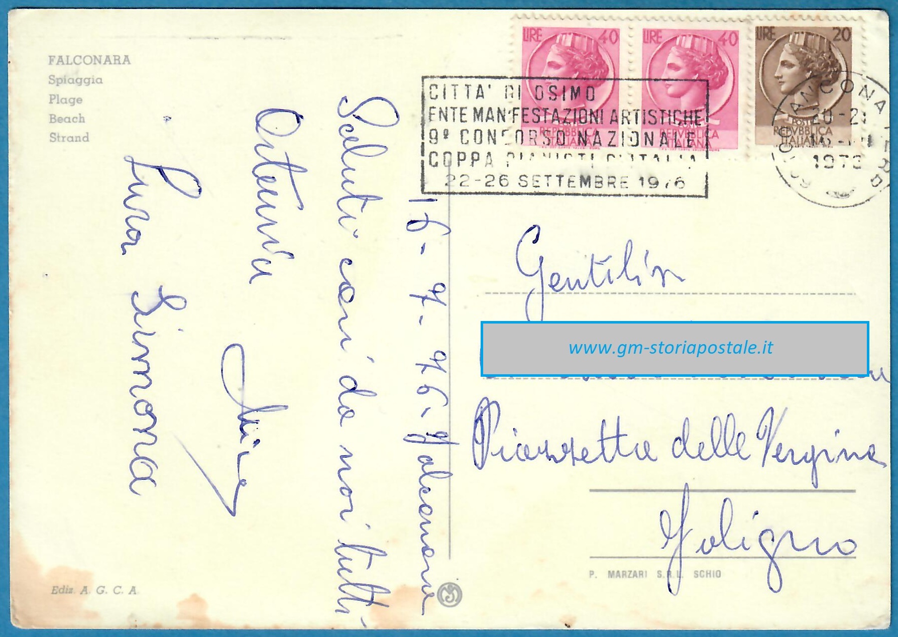 Coppia del 40 lire Siracusana fluorescente + 20 lire Siracusana – Annullo con targhetta di Ancona, 16 luglio 1976: