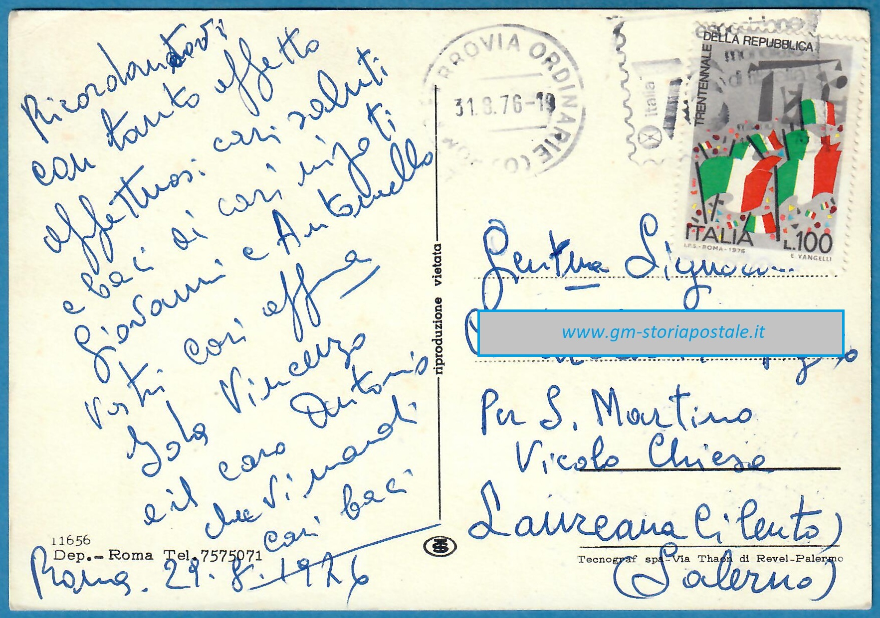 100 lire Trentennale della Repubblica isolato – annullo con targhetta di Roma, 31 agosto 1976: