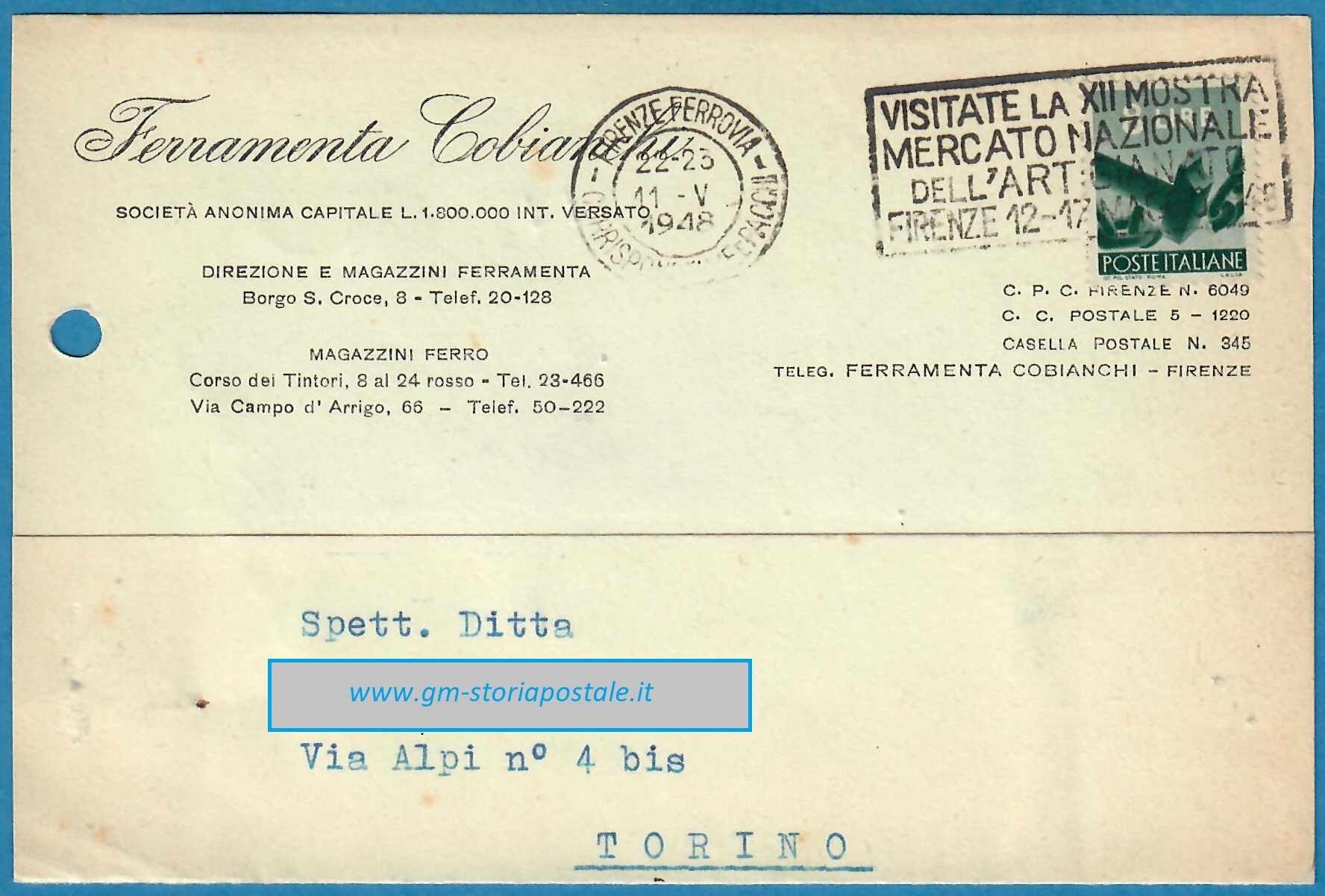 8 lire Democratica isolato – annullo con targhetta di Firenze, 11 maggio 1948: