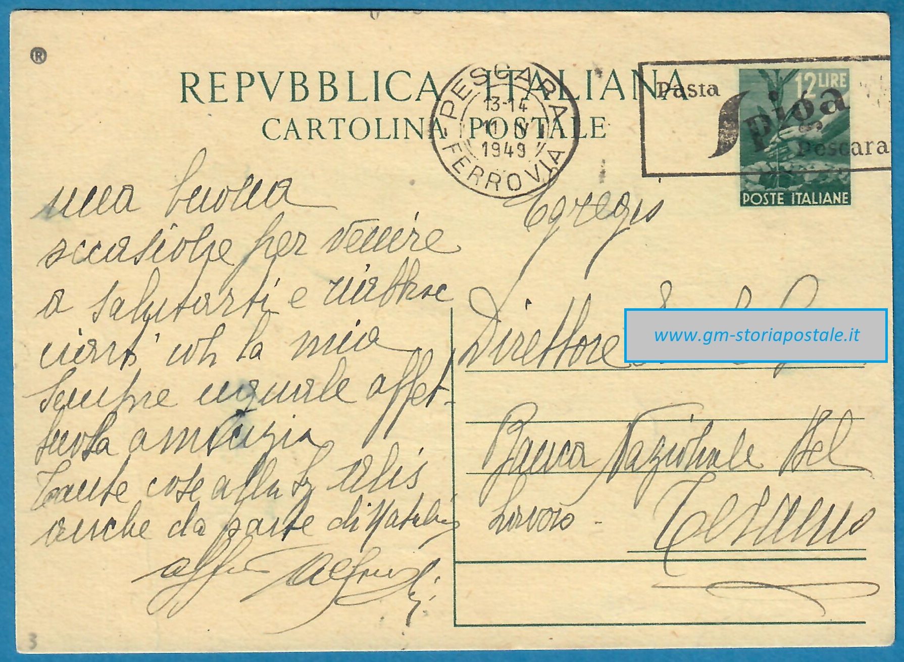 Cartolina postale da 12 lire Democratica senza integrazioni – annullo con targhetta di Pescara, 11 aprile 1949: