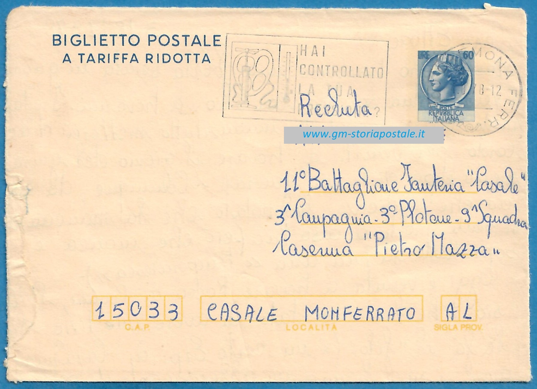Biglietto postale a tariffa ridotta tra 1.11.1976 e 31.12.1980 Biglietto Postale 60 lire Siracusana senza integrazioni – annullo con targhetta di Cremona, 4 agosto 1978: