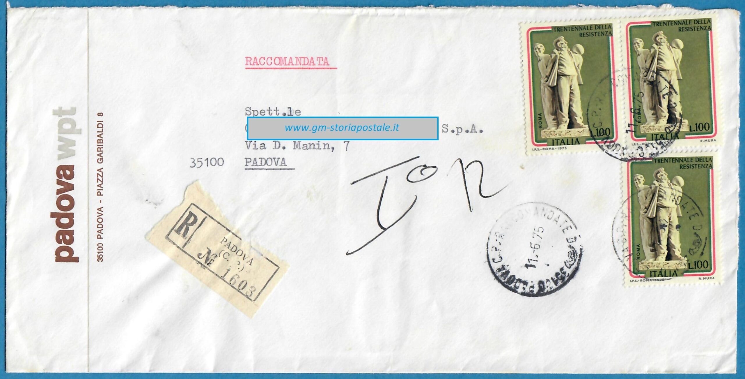 Fino al 24 marzo 1975 una lettera per l’interno primo porto raccomandata si affrancava con 180 lire. A partire dal 25 marzo 1975 la tariffa per affrancare una lettera primo porto per l’interno aumentò da 50 a 100 lire, mentre la soprattassa per la raccomandazione aumentò da 130 lire a 200 lire: la tariffa aumentò pertanto da 180 lire a 300 lire.
