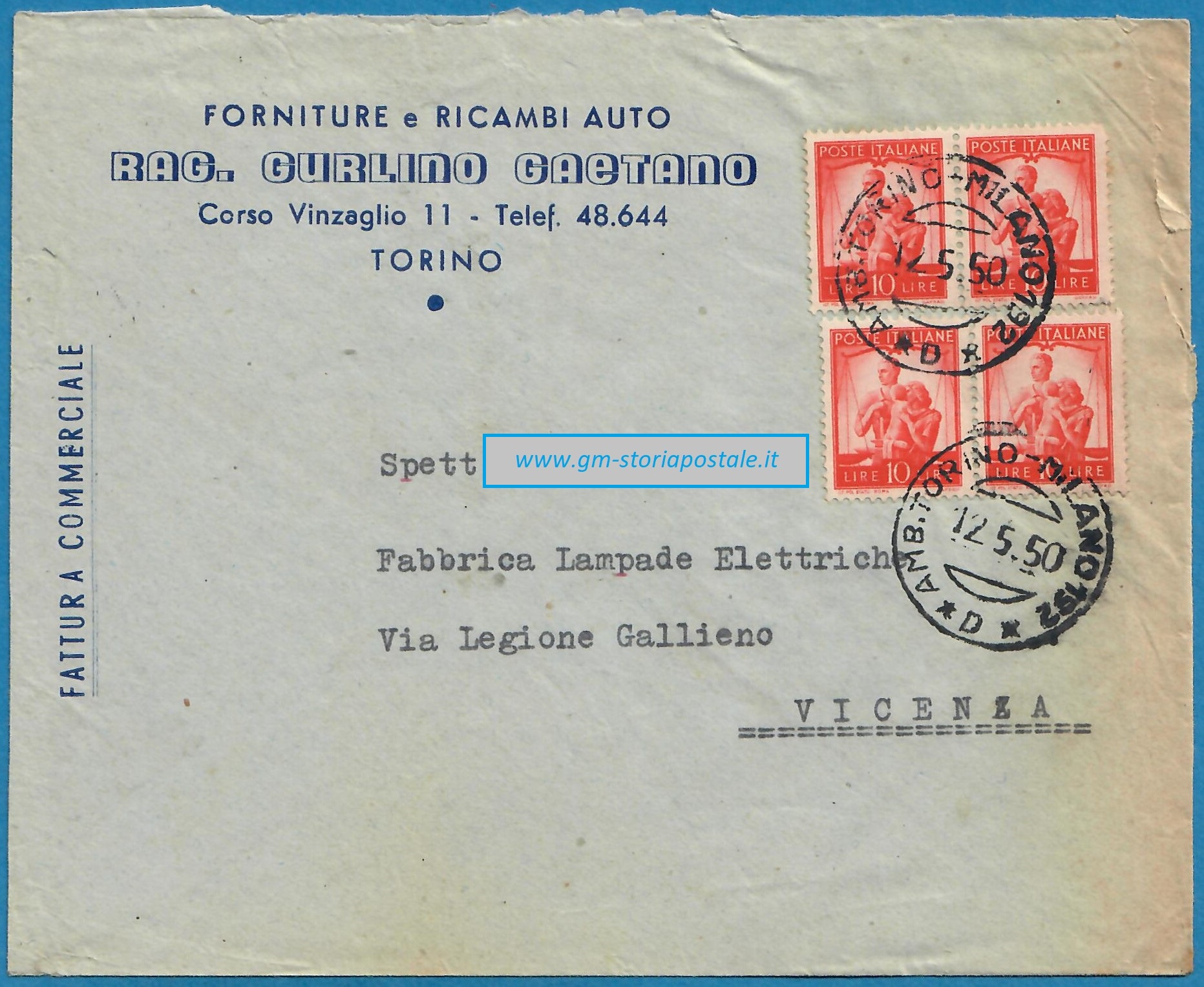 Quattro esemplari del 10 lire Democratica arancioAmbulante Torino Milano, 12 maggio 1950: