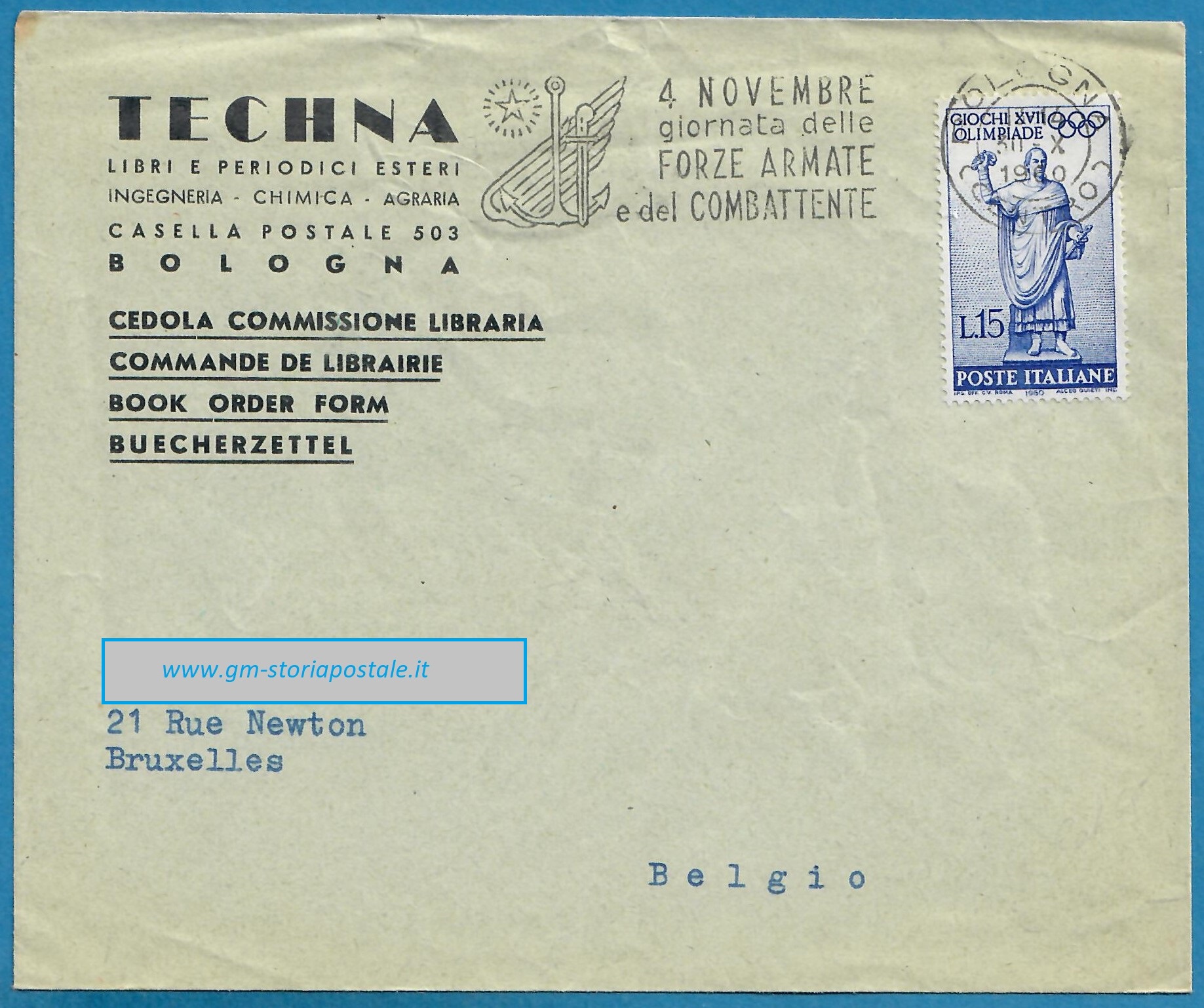 15 lire Olimpiadi di Roma isolato – annullo con targhetta di Bologna, 30 ottobre 1960: