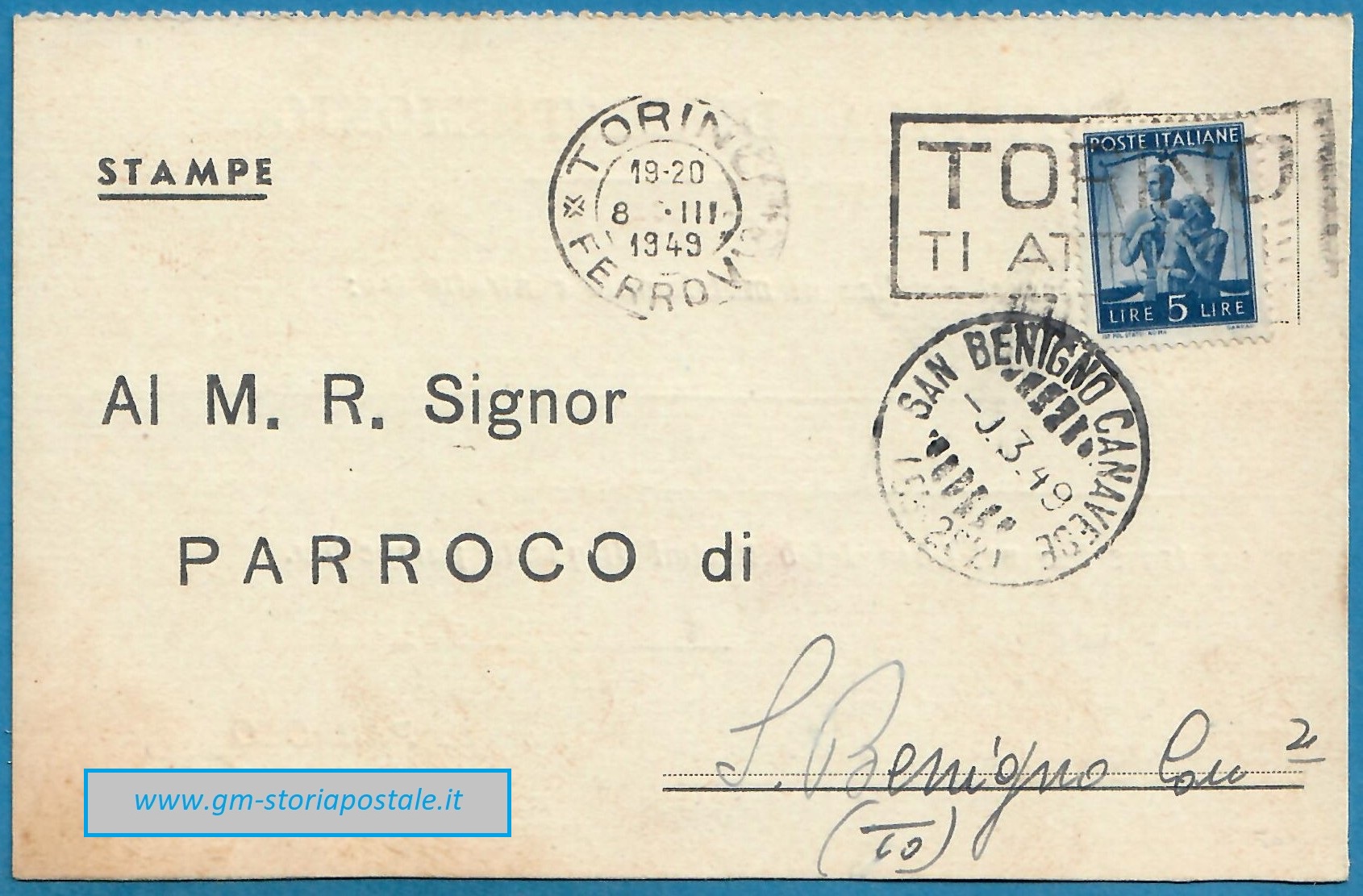 5 lire Democratica isolato – annullo con targhetta di Torino, 8 marzo 1949 e frazionario in arrivo a San Benigno Canavese: