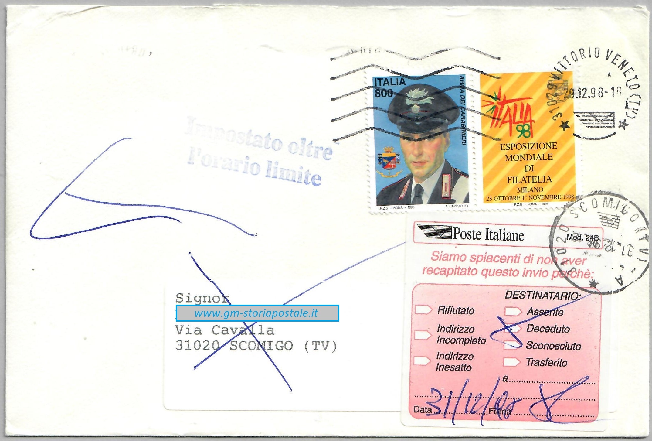 800 lire Arma dei Carabinieri su lettera primo porto per destinatario deceduto – Vittorio Veneto, 29 dicembre 1998: