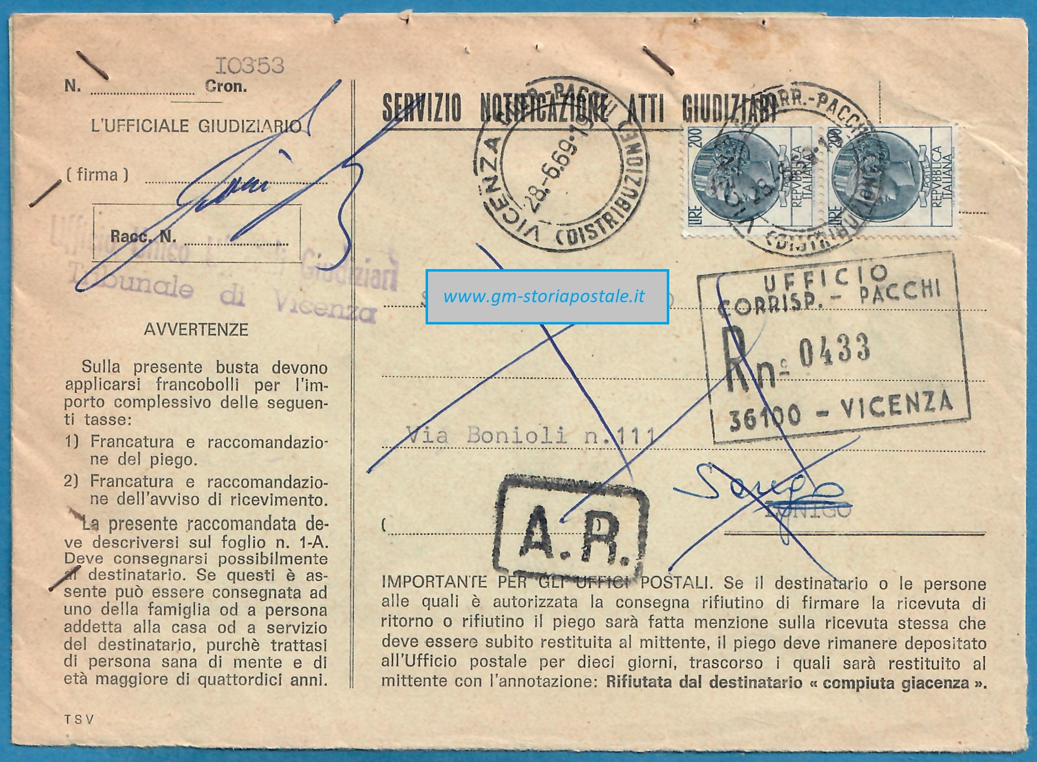 Vicenza, 28 giugno 1969: atti giudiziari come lettera tra 20 e 100 grammi affrancati con coppia del 200 lire Siracusana stelle. Destinazione “Lonigo” barrata e corretta in “Sarego”, bollo di arrivo a Lonigo il 30 giugno successivo e bollo di ritorno a Vicenza del 1° luglio 1969 senza specifiche indicazioni del mancato recapito.