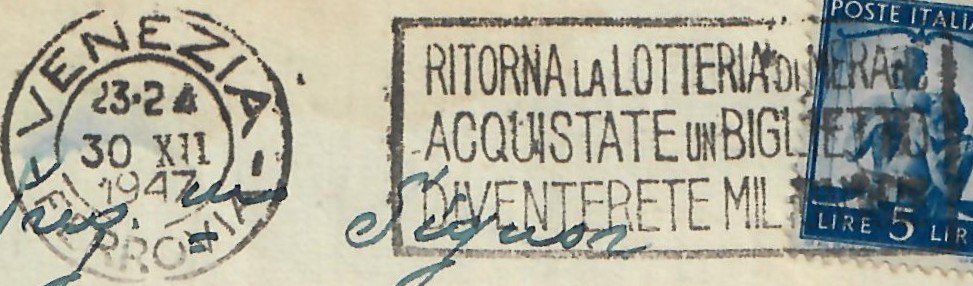 Biglietto da visita in busta aperta affrancato con il 5 lire Democratica – Venezia, 30 dicembre 1947: