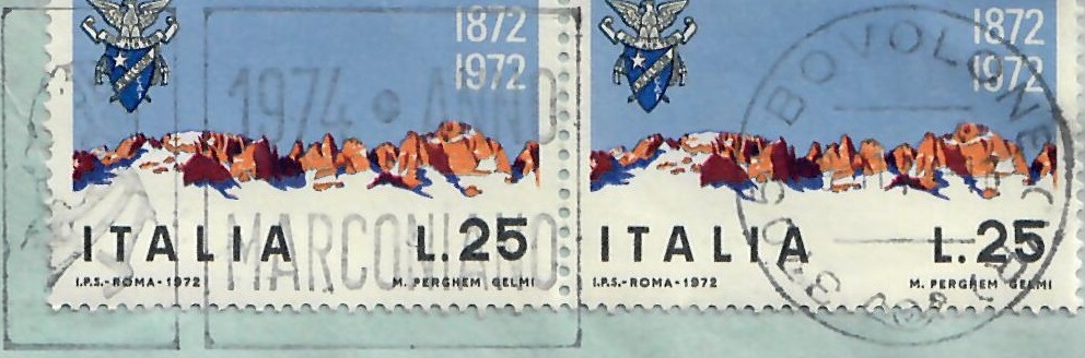 Lettera primo porto affrancata con coppia del 25 lire Società Alpinisti Tridentini – Bovolone, 8 novembre 1974: