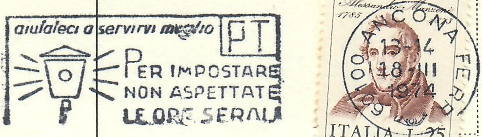 Cartolina illustrata entro cinque parole affrancata con il 25 lire Alessandro Manzoni – Ancona, 18 marzo 1974: