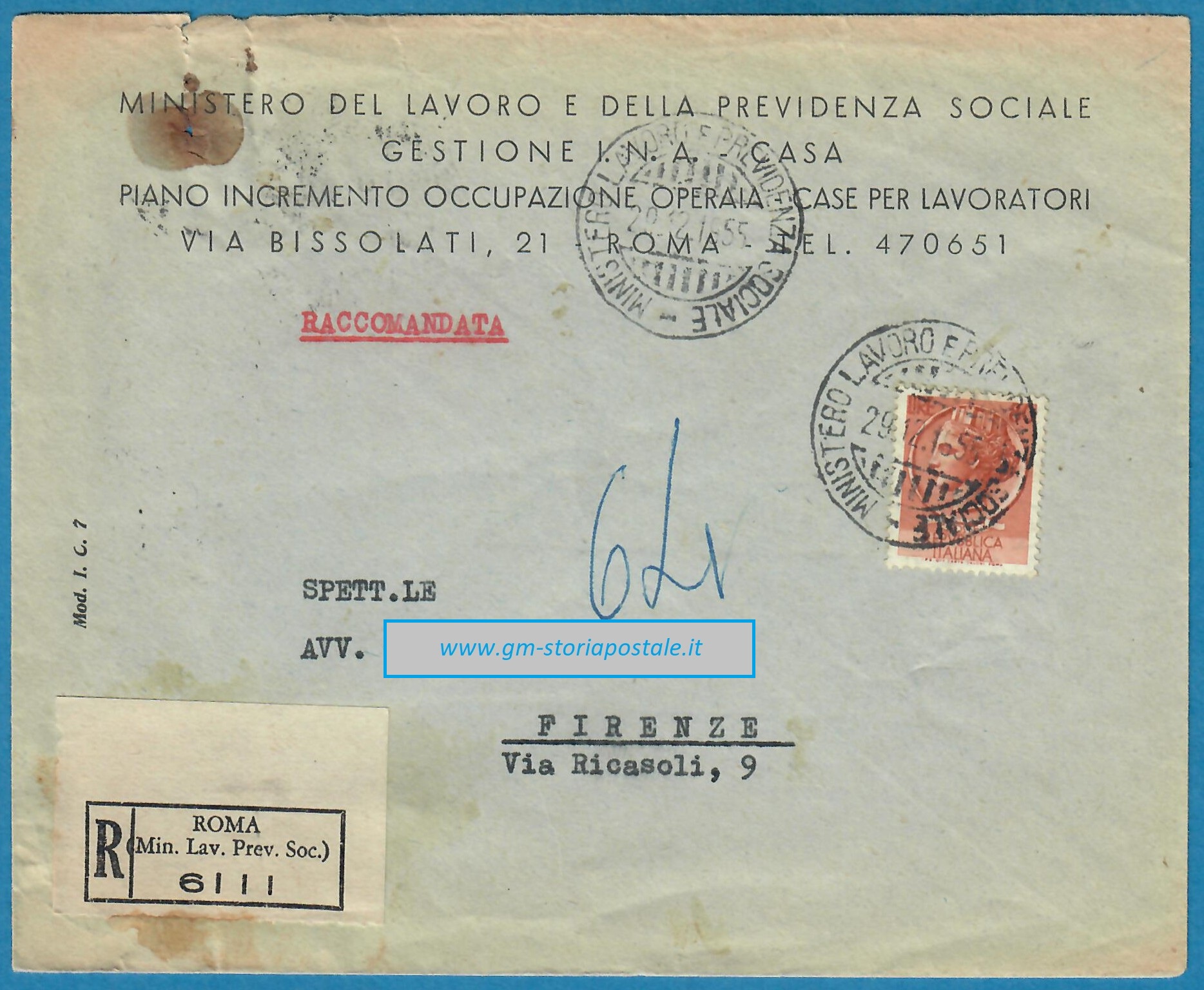 Roma, 9 dicembre 1954 – lettera primo porto raccomandata espresso affrancata con l’80 lire Siracusana ruota + 50 lire espressi Democratica: