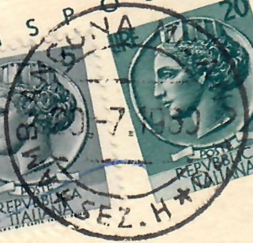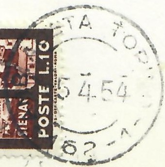 Usato per annullare il 10 lire Turistica 1953 su una cartolina entro 5 parole,5 agosto 1954: