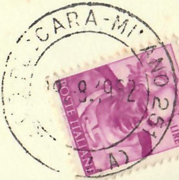 Usato per annullare il 15 lire Michelangiolesca su una cartolina illustrata entro cinque parole, 18 agosto 1962: